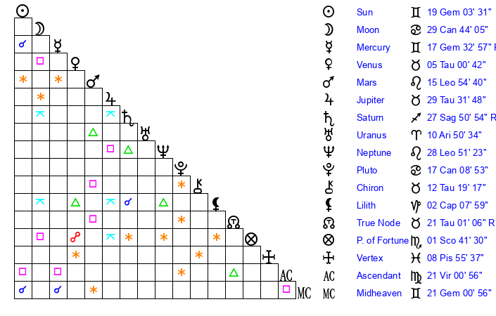 | Sun | 19 Gemini 4 | 19 Gemini 49 | 21 Virgo 8 |
