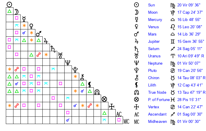 | Sun | 20 Virgo 9 | 20 Virgo 55 | 26 Sagittarius 4 |