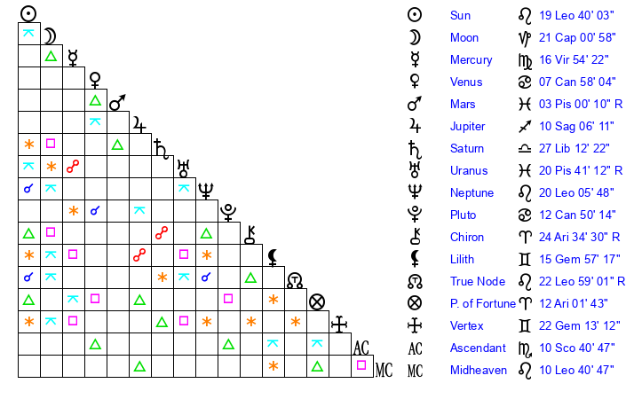 | Moon | 20 Capricorn 59 | 3 Aries 42 | 22 Virgo 16 |