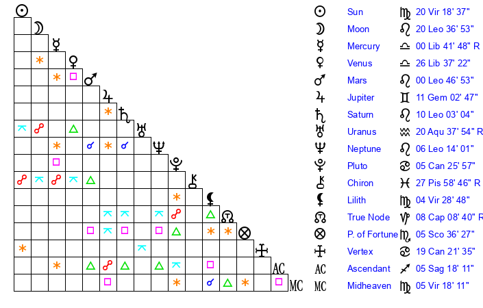 | Sun | 20 Virgo 18 | 21 Virgo 9 | 8 Capricorn 27 |