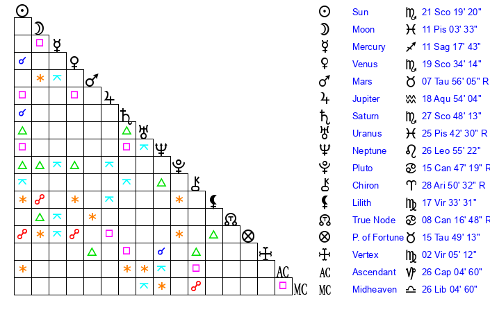 | Venus | 19 Scorpio 35 | 9 Scorpio 25 | 23 Pisces 42 |