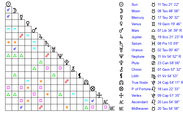 | Sun | 11 Taurus 21 | 12 Taurus 32 | 7 Leo 32 |