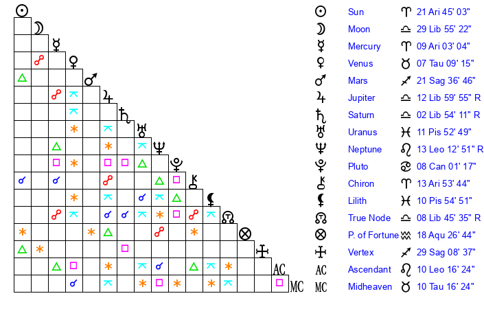 | Sun | 21 Aries 45 | 22 Aries 47 | 0 Leo 45 |
