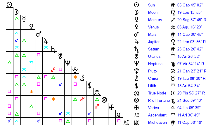 | Moon | 19 Leo 7 | 7 Sagittarius 50 | 25 Capricorn 26 |