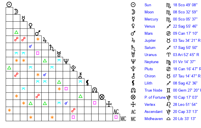 | Sun | 18 Scorpio 49 | 19 Scorpio 18 | 27 Aquarius 18 |