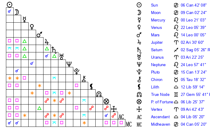 | Neptune | 24 Leo 58 | 2 Aries 9 | 28 Leo 18 |