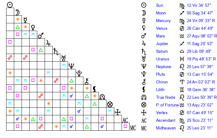 | Sun | 12 Virgo 35 | 13 Virgo 8 | 23 Sagittarius 13 |