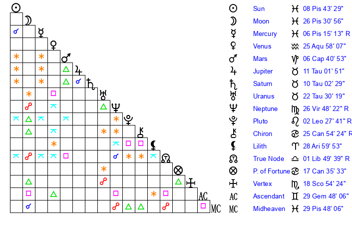 | Moon | 26 Pisces 24 | 4 Pisces 55 | 22 Aries 49 |