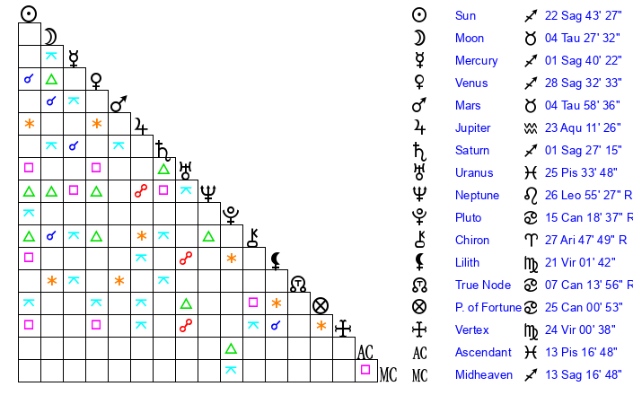 | Sun | 22 Sagittarius 44 | 23 Sagittarius 58 | 1 Aries 49 |
