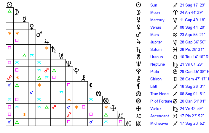 | Sun | 21 Sagittarius 17 | 21 Sagittarius 56 | 20 Pisces 28 |