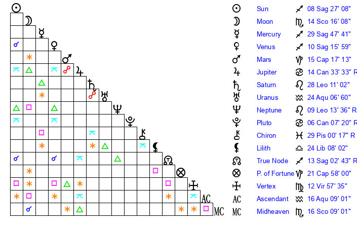 | Moon | 14 Scorpio 19 | 12 Sagittarius 1 | 4 Libra 43 |