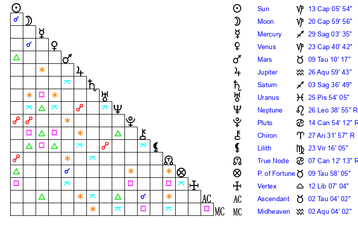 | Moon | 20 Capricorn 57 | 11 Pisces 18 | 0 Virgo 17 |