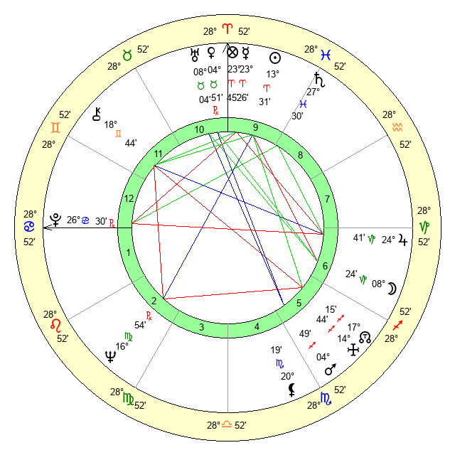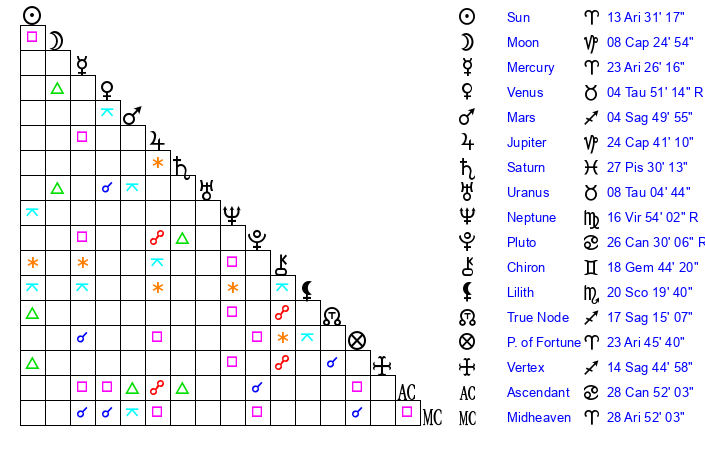 | Sun | 13 Aries 31 | 14 Aries 11 | 8 Cancer 27 |