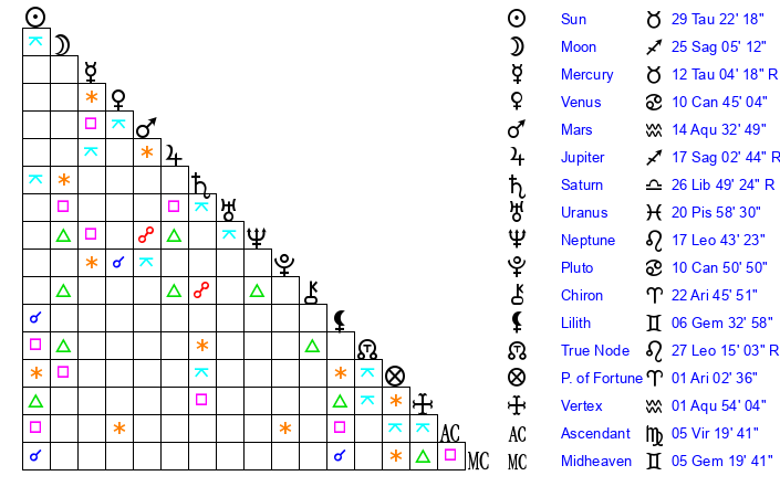 | Jupiter | 16 Sagittarius 46 | 25 Gemini 30 | 10 Sagittarius 36 |