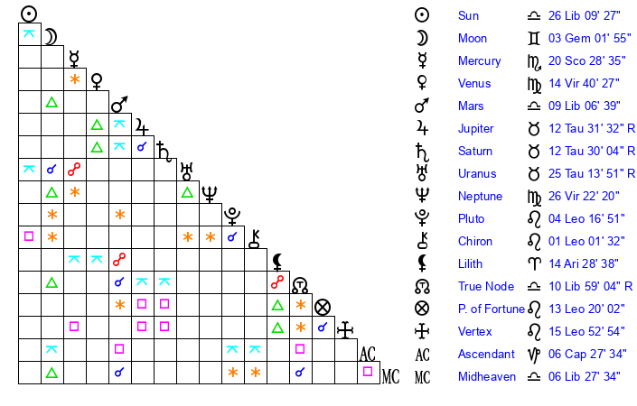 | Sun | 26 Libra 9 | 26 Libra 34 | 22 Capricorn 8 |