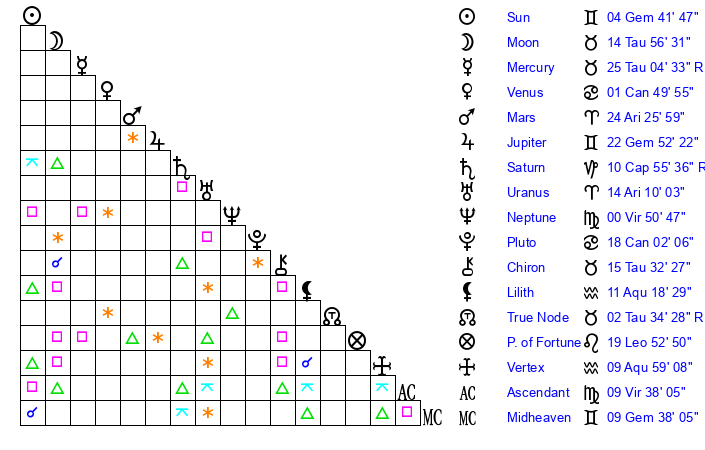 | Moon | 14 Taurus 58 | 29 Taurus 50 | 20 Scorpio 17 |