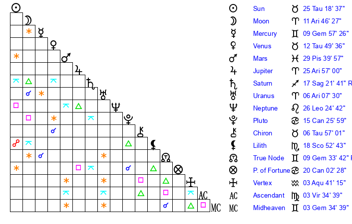 | Sun | 25 Taurus 19 | 25 Taurus 50 | 28 Leo 7 |
