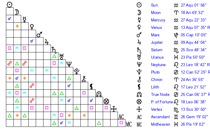 | Sun | 27 Aquarius 2 | 28 Aquarius 1 | 4 Gemini 26 |