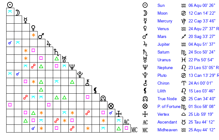 | Sun | 6 Aquarius 1 | 7 Aquarius 0 | 14 Taurus 26 |