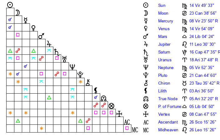 | Venus | 14 Virgo 54 | 16 Leo 33 | 12 Capricorn 8 |