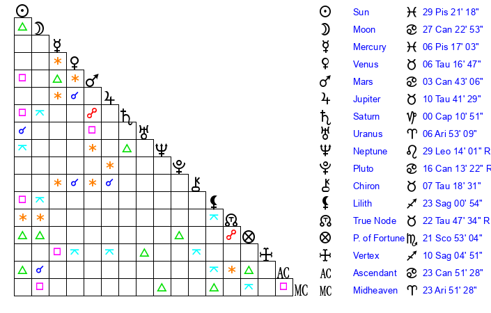 | Sun | 29 Pisces 21 | 0 Aries 5 | 2 Cancer 25 |