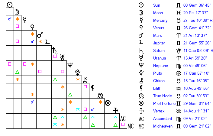 | Sun | 0 Gemini 37 | 1 Gemini 37 | 1 Virgo 30 |