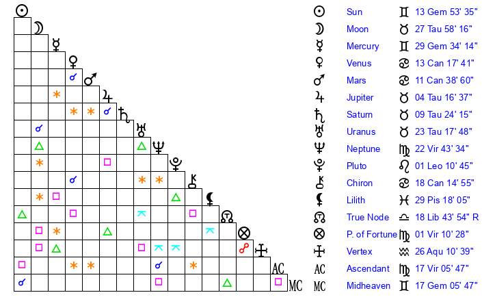 | Jupiter | 4 Taurus 13 | 28 Gemini 50 | 15 Taurus 30 |