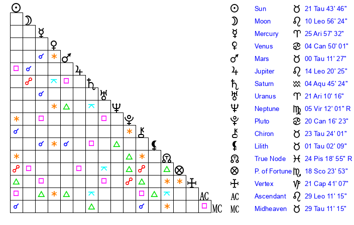| Sun | 21 Taurus 44 | 22 Taurus 13 | 20 Leo 42 |