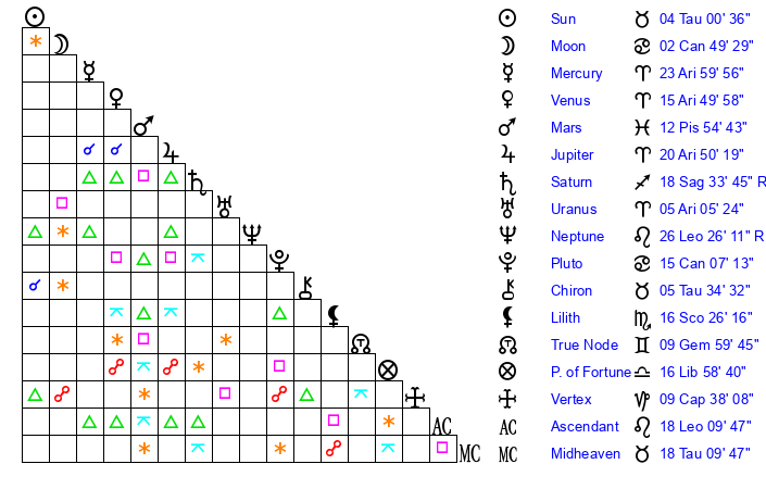 | Sun | 4 Taurus 1 | 4 Taurus 31 | 7 Leo 0 |