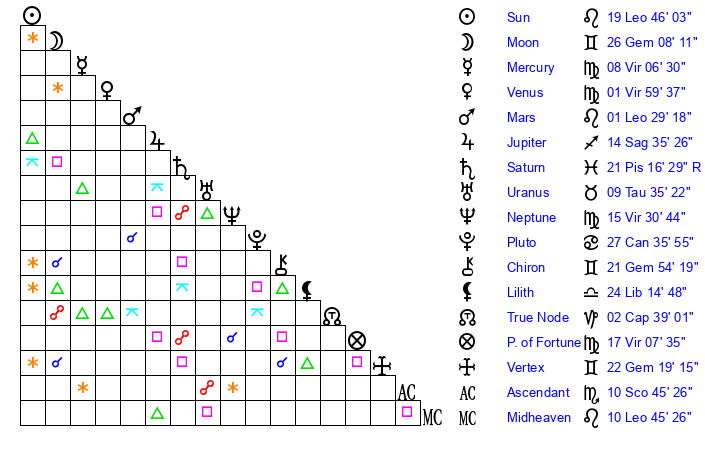 | Moon | 26 Gemini 0 | 3 Aries 42 | 28 Virgo 22 |