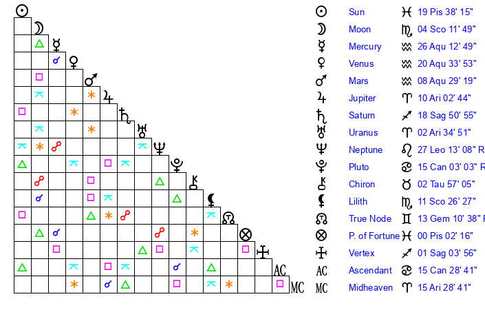 | Sun | 19 Pisces 38 | 20 Pisces 7 | 24 Gemini 4 |