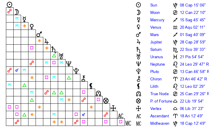 | Moon | 12 Cancer 18 | 3 Capricorn 27 | 22 Aquarius 13 |