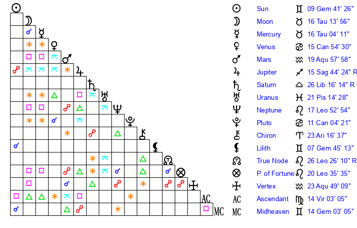 | Jupiter | 15 Sagittarius 28 | 27 Gemini 53 | 11 Sagittarius 30 |