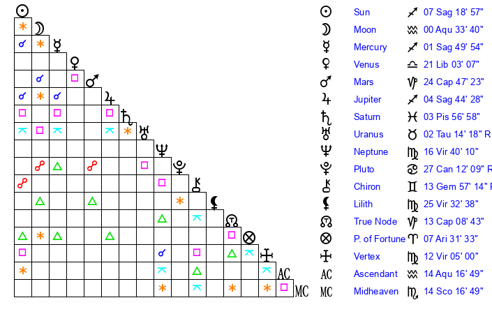 | Moon | 0 Aquarius 31 | 5 Aries 53 | 26 Taurus 49 |