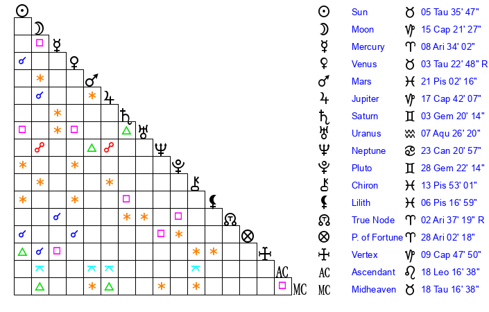 | Sun | 5 Taurus 36 | 6 Taurus 28 | 22 Leo 57 |