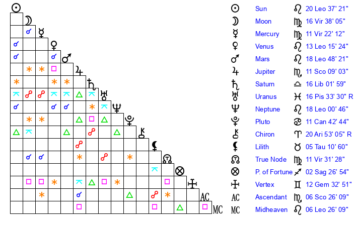 | Sun | 20 Leo 37 | 21 Leo 55 | 1 Sagittarius 9 |