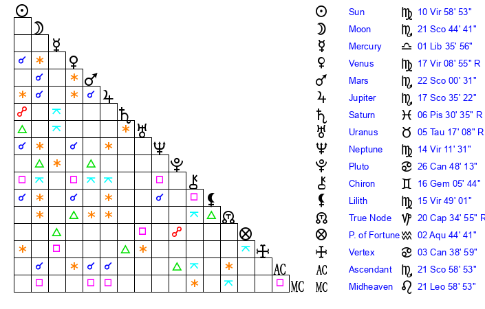 | Sun | 10 Virgo 58 | 12 Virgo 10 | 10 Sagittarius 21 |