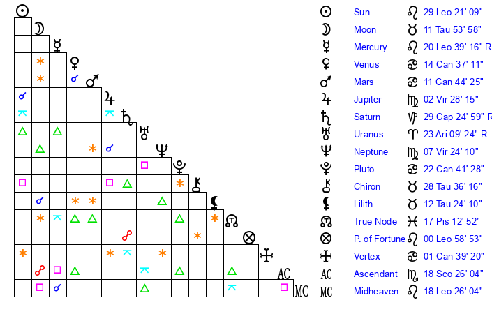 | Mercury | 20 Leo 39 | 11 Leo 50 | 20 Sagittarius 30 |