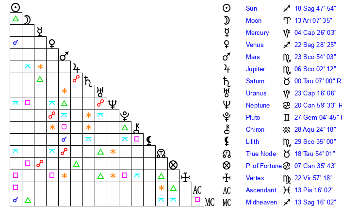Sun | 18 Sagittarius 48 | 20 Sagittarius 9 | 13 Aries 48 |
