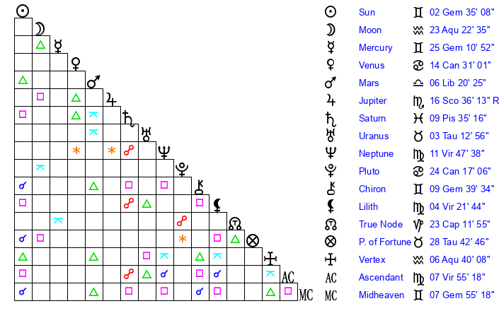 | Moon | 23 Aquarius 22 | 29 Aries 41 | 17 Gemini 43 |
