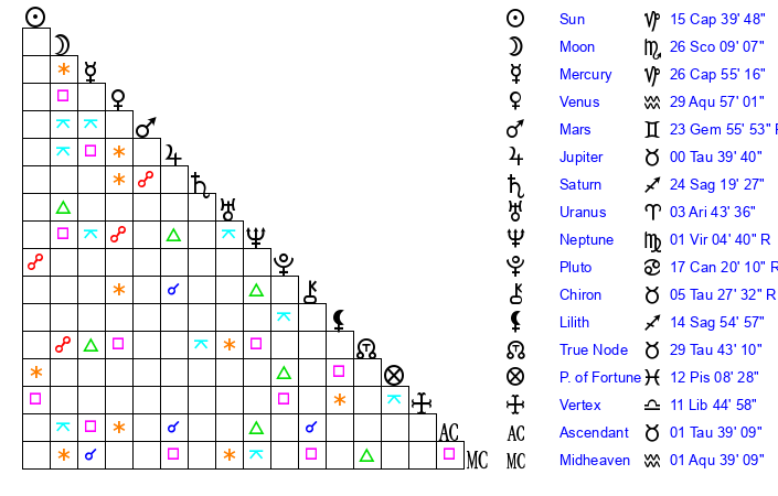 | Saturn | 24 Sagittarius 39 | 14 Pisces 53 | 0 Capricorn 50 |