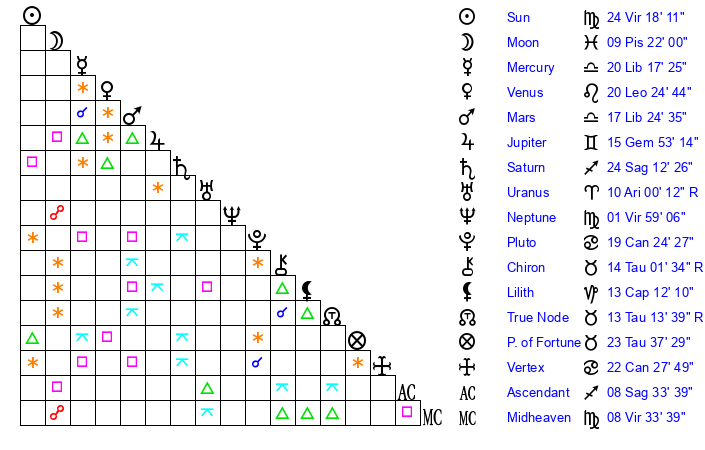 | Moon | 9 Pisces 26 | 6 Leo 20 | 25 Virgo 20 |
