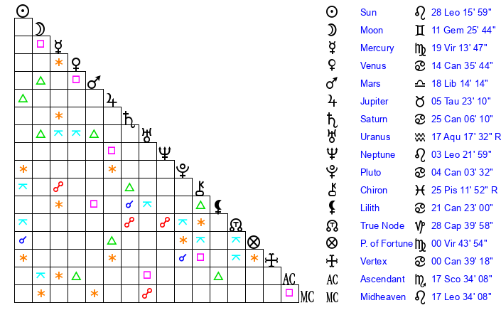 | Moon | 11 Gemini 34 | 9 Leo 47 | 6 Gemini 52 |