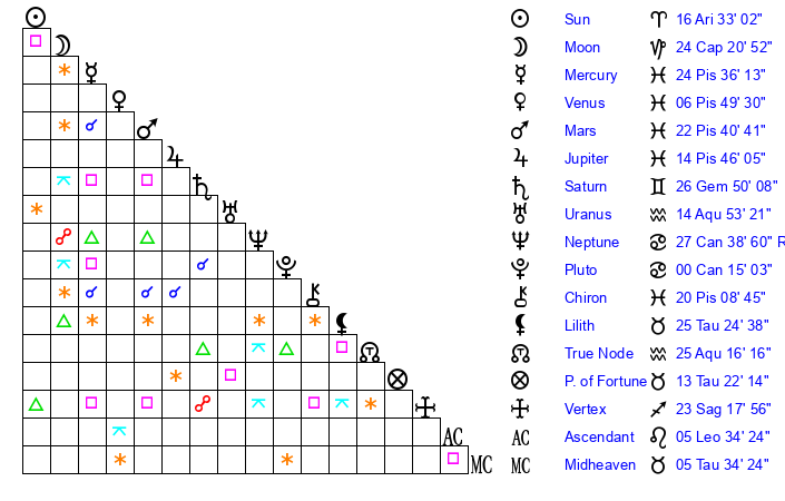 | Sun | 16 Aries 33 | 17 Aries 53 | 2 Leo 22 |