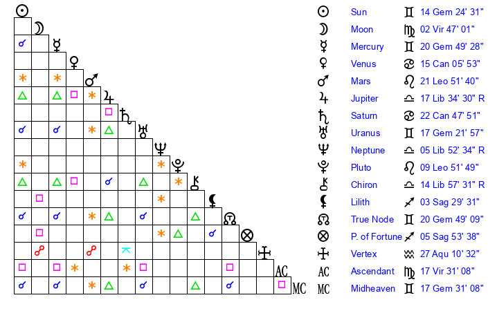 | Jupiter | 17 Libra 25 | 29 Gemini 4 | 23 Libra 46 |