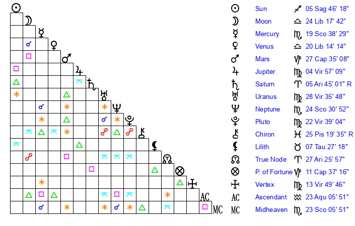 Moon | 24 Libra 26 | 8 Scorpio 18 | 28 Scorpio 40 |