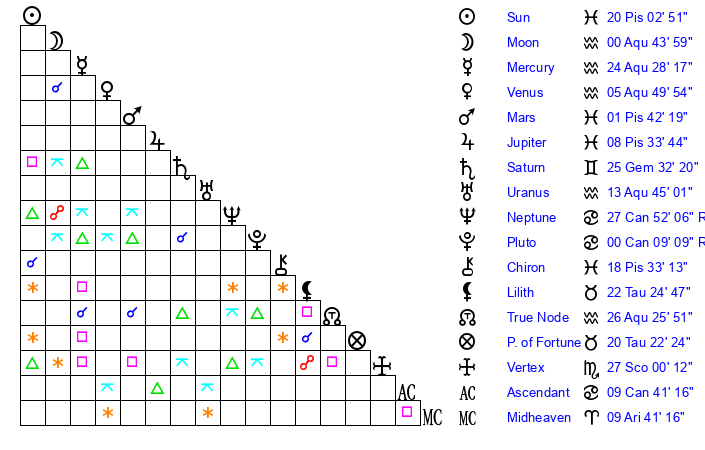 | Moon | 0 Aquarius 43 | 22 Leo 9 | 11 Aquarius 21 |