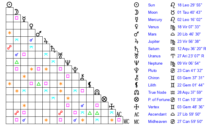 | Moon | 1 Taurus 47 | 19 Pisces 7 | 1 Virgo 49 |