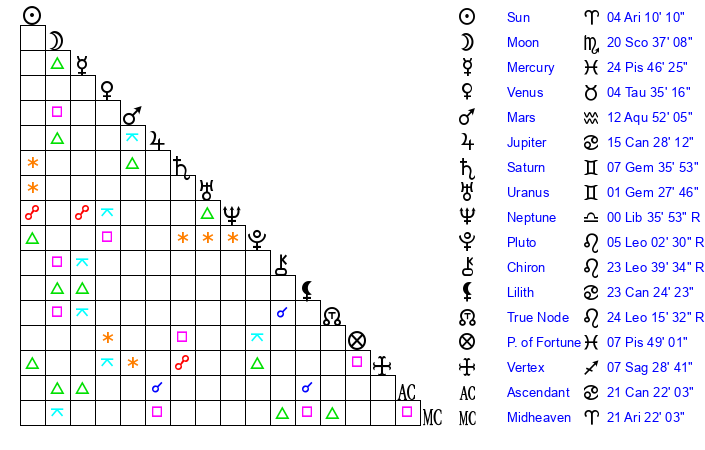 | Moon | 20 Scorpio 38 | 14 Aquarius 24 | 19 Scorpio 28 |