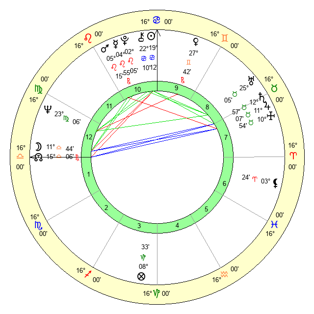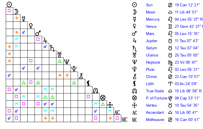 | Moon | 11 Libra 46 | 29 Capricorn 53 | 25 Scorpio 45 |